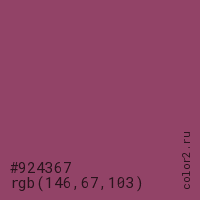 Цвет #924367 в цветовой модели RGB обозначается тремя октетами (146, 67, 103) в десятичном формате и #924367 в шестнадцатиричном (hex) формате, которые являются интенсивностью красного 146 (hex 92), интенсивность зелёного 67 (hex 43) и интенсивность синего 103 (hex 67).