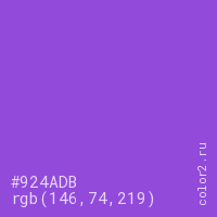 Цвет #924ADB в цветовой модели RGB обозначается тремя октетами (146, 74, 219) в десятичном формате и #924ADB в шестнадцатиричном (hex) формате, которые являются интенсивностью красного 146 (hex 92), интенсивность зелёного 74 (hex 4A) и интенсивность синего 219 (hex DB).