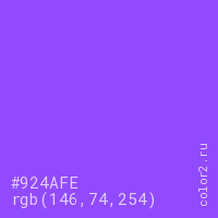 Цвет #924AFE в цветовой модели RGB обозначается тремя октетами (146, 74, 254) в десятичном формате и #924AFE в шестнадцатиричном (hex) формате, которые являются интенсивностью красного 146 (hex 92), интенсивность зелёного 74 (hex 4A) и интенсивность синего 254 (hex FE).