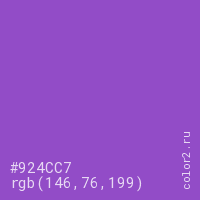 Цвет #924CC7 в цветовой модели RGB обозначается тремя октетами (146, 76, 199) в десятичном формате и #924CC7 в шестнадцатиричном (hex) формате, которые являются интенсивностью красного 146 (hex 92), интенсивность зелёного 76 (hex 4C) и интенсивность синего 199 (hex C7).