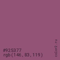 Цвет #925377 в цветовой модели RGB обозначается тремя октетами (146, 83, 119) в десятичном формате и #925377 в шестнадцатиричном (hex) формате, которые являются интенсивностью красного 146 (hex 92), интенсивность зелёного 83 (hex 53) и интенсивность синего 119 (hex 77).