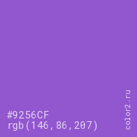 Цвет #9256CF в цветовой модели RGB обозначается тремя октетами (146, 86, 207) в десятичном формате и #9256CF в шестнадцатиричном (hex) формате, которые являются интенсивностью красного 146 (hex 92), интенсивность зелёного 86 (hex 56) и интенсивность синего 207 (hex CF).
