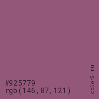 Цвет #925779 в цветовой модели RGB обозначается тремя октетами (146, 87, 121) в десятичном формате и #925779 в шестнадцатиричном (hex) формате, которые являются интенсивностью красного 146 (hex 92), интенсивность зелёного 87 (hex 57) и интенсивность синего 121 (hex 79).