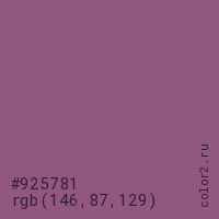 Цвет #925781 в цветовой модели RGB обозначается тремя октетами (146, 87, 129) в десятичном формате и #925781 в шестнадцатиричном (hex) формате, которые являются интенсивностью красного 146 (hex 92), интенсивность зелёного 87 (hex 57) и интенсивность синего 129 (hex 81).