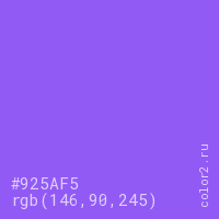 Цвет #925AF5 в цветовой модели RGB обозначается тремя октетами (146, 90, 245) в десятичном формате и #925AF5 в шестнадцатиричном (hex) формате, которые являются интенсивностью красного 146 (hex 92), интенсивность зелёного 90 (hex 5A) и интенсивность синего 245 (hex F5).