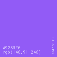 Цвет #925BF6 в цветовой модели RGB обозначается тремя октетами (146, 91, 246) в десятичном формате и #925BF6 в шестнадцатиричном (hex) формате, которые являются интенсивностью красного 146 (hex 92), интенсивность зелёного 91 (hex 5B) и интенсивность синего 246 (hex F6).
