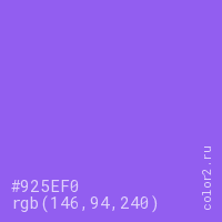 Цвет #925EF0 в цветовой модели RGB обозначается тремя октетами (146, 94, 240) в десятичном формате и #925EF0 в шестнадцатиричном (hex) формате, которые являются интенсивностью красного 146 (hex 92), интенсивность зелёного 94 (hex 5E) и интенсивность синего 240 (hex F0).
