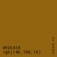Цвет #926410 в цветовой модели RGB обозначается тремя октетами (146, 100, 16) в десятичном формате и #926410 в шестнадцатиричном (hex) формате, которые являются интенсивностью красного 146 (hex 92), интенсивность зелёного 100 (hex 64) и интенсивность синего 16 (hex 10).