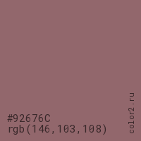 Цвет #92676C в цветовой модели RGB обозначается тремя октетами (146, 103, 108) в десятичном формате и #92676C в шестнадцатиричном (hex) формате, которые являются интенсивностью красного 146 (hex 92), интенсивность зелёного 103 (hex 67) и интенсивность синего 108 (hex 6C).