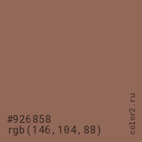 Цвет #926858 в цветовой модели RGB обозначается тремя октетами (146, 104, 88) в десятичном формате и #926858 в шестнадцатиричном (hex) формате, которые являются интенсивностью красного 146 (hex 92), интенсивность зелёного 104 (hex 68) и интенсивность синего 88 (hex 58).