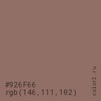 Цвет #926F66 в цветовой модели RGB обозначается тремя октетами (146, 111, 102) в десятичном формате и #926F66 в шестнадцатиричном (hex) формате, которые являются интенсивностью красного 146 (hex 92), интенсивность зелёного 111 (hex 6F) и интенсивность синего 102 (hex 66).