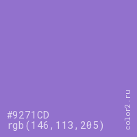 Цвет #9271CD в цветовой модели RGB обозначается тремя октетами (146, 113, 205) в десятичном формате и #9271CD в шестнадцатиричном (hex) формате, которые являются интенсивностью красного 146 (hex 92), интенсивность зелёного 113 (hex 71) и интенсивность синего 205 (hex CD).