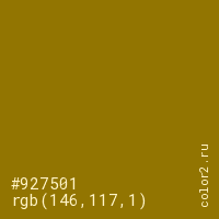 Цвет #927501 в цветовой модели RGB обозначается тремя октетами (146, 117, 1) в десятичном формате и #927501 в шестнадцатиричном (hex) формате, которые являются интенсивностью красного 146 (hex 92), интенсивность зелёного 117 (hex 75) и интенсивность синего 1 (hex 01).