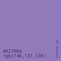 Цвет #9279BA в цветовой модели RGB обозначается тремя октетами (146, 121, 186) в десятичном формате и #9279BA в шестнадцатиричном (hex) формате, которые являются интенсивностью красного 146 (hex 92), интенсивность зелёного 121 (hex 79) и интенсивность синего 186 (hex BA).