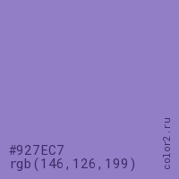 Цвет #927EC7 в цветовой модели RGB обозначается тремя октетами (146, 126, 199) в десятичном формате и #927EC7 в шестнадцатиричном (hex) формате, которые являются интенсивностью красного 146 (hex 92), интенсивность зелёного 126 (hex 7E) и интенсивность синего 199 (hex C7).