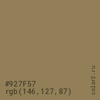 Цвет #927F57 в цветовой модели RGB обозначается тремя октетами (146, 127, 87) в десятичном формате и #927F57 в шестнадцатиричном (hex) формате, которые являются интенсивностью красного 146 (hex 92), интенсивность зелёного 127 (hex 7F) и интенсивность синего 87 (hex 57).