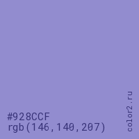Цвет #928CCF в цветовой модели RGB обозначается тремя октетами (146, 140, 207) в десятичном формате и #928CCF в шестнадцатиричном (hex) формате, которые являются интенсивностью красного 146 (hex 92), интенсивность зелёного 140 (hex 8C) и интенсивность синего 207 (hex CF).