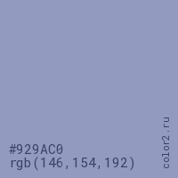 Цвет #929AC0 в цветовой модели RGB обозначается тремя октетами (146, 154, 192) в десятичном формате и #929AC0 в шестнадцатиричном (hex) формате, которые являются интенсивностью красного 146 (hex 92), интенсивность зелёного 154 (hex 9A) и интенсивность синего 192 (hex C0).