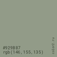 Цвет #929B87 в цветовой модели RGB обозначается тремя октетами (146, 155, 135) в десятичном формате и #929B87 в шестнадцатиричном (hex) формате, которые являются интенсивностью красного 146 (hex 92), интенсивность зелёного 155 (hex 9B) и интенсивность синего 135 (hex 87).