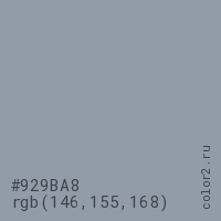 Цвет #929BA8 в цветовой модели RGB обозначается тремя октетами (146, 155, 168) в десятичном формате и #929BA8 в шестнадцатиричном (hex) формате, которые являются интенсивностью красного 146 (hex 92), интенсивность зелёного 155 (hex 9B) и интенсивность синего 168 (hex A8).