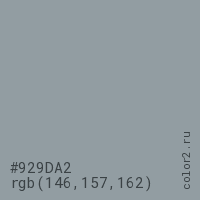 Цвет #929DA2 в цветовой модели RGB обозначается тремя октетами (146, 157, 162) в десятичном формате и #929DA2 в шестнадцатиричном (hex) формате, которые являются интенсивностью красного 146 (hex 92), интенсивность зелёного 157 (hex 9D) и интенсивность синего 162 (hex A2).