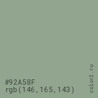 Цвет #92A58F в цветовой модели RGB обозначается тремя октетами (146, 165, 143) в десятичном формате и #92A58F в шестнадцатиричном (hex) формате, которые являются интенсивностью красного 146 (hex 92), интенсивность зелёного 165 (hex A5) и интенсивность синего 143 (hex 8F).