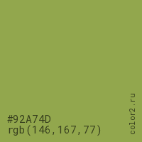 Цвет #92A74D в цветовой модели RGB обозначается тремя октетами (146, 167, 77) в десятичном формате и #92A74D в шестнадцатиричном (hex) формате, которые являются интенсивностью красного 146 (hex 92), интенсивность зелёного 167 (hex A7) и интенсивность синего 77 (hex 4D).