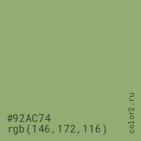 Цвет #92AC74 в цветовой модели RGB обозначается тремя октетами (146, 172, 116) в десятичном формате и #92AC74 в шестнадцатиричном (hex) формате, которые являются интенсивностью красного 146 (hex 92), интенсивность зелёного 172 (hex AC) и интенсивность синего 116 (hex 74).