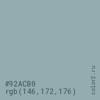 Цвет #92ACB0 в цветовой модели RGB обозначается тремя октетами (146, 172, 176) в десятичном формате и #92ACB0 в шестнадцатиричном (hex) формате, которые являются интенсивностью красного 146 (hex 92), интенсивность зелёного 172 (hex AC) и интенсивность синего 176 (hex B0).