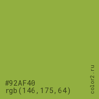 Цвет #92AF40 в цветовой модели RGB обозначается тремя октетами (146, 175, 64) в десятичном формате и #92AF40 в шестнадцатиричном (hex) формате, которые являются интенсивностью красного 146 (hex 92), интенсивность зелёного 175 (hex AF) и интенсивность синего 64 (hex 40).