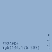 Цвет #92AFD0 в цветовой модели RGB обозначается тремя октетами (146, 175, 208) в десятичном формате и #92AFD0 в шестнадцатиричном (hex) формате, которые являются интенсивностью красного 146 (hex 92), интенсивность зелёного 175 (hex AF) и интенсивность синего 208 (hex D0).
