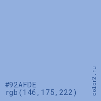 Цвет #92AFDE в цветовой модели RGB обозначается тремя октетами (146, 175, 222) в десятичном формате и #92AFDE в шестнадцатиричном (hex) формате, которые являются интенсивностью красного 146 (hex 92), интенсивность зелёного 175 (hex AF) и интенсивность синего 222 (hex DE).