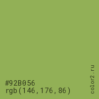 Цвет #92B056 в цветовой модели RGB обозначается тремя октетами (146, 176, 86) в десятичном формате и #92B056 в шестнадцатиричном (hex) формате, которые являются интенсивностью красного 146 (hex 92), интенсивность зелёного 176 (hex B0) и интенсивность синего 86 (hex 56).