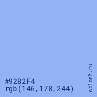 Цвет #92B2F4 в цветовой модели RGB обозначается тремя октетами (146, 178, 244) в десятичном формате и #92B2F4 в шестнадцатиричном (hex) формате, которые являются интенсивностью красного 146 (hex 92), интенсивность зелёного 178 (hex B2) и интенсивность синего 244 (hex F4).
