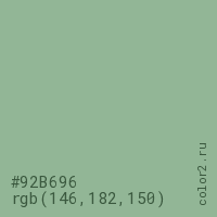 Цвет #92B696 в цветовой модели RGB обозначается тремя октетами (146, 182, 150) в десятичном формате и #92B696 в шестнадцатиричном (hex) формате, которые являются интенсивностью красного 146 (hex 92), интенсивность зелёного 182 (hex B6) и интенсивность синего 150 (hex 96).