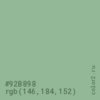 Цвет #92B898 в цветовой модели RGB обозначается тремя октетами (146, 184, 152) в десятичном формате и #92B898 в шестнадцатиричном (hex) формате, которые являются интенсивностью красного 146 (hex 92), интенсивность зелёного 184 (hex B8) и интенсивность синего 152 (hex 98).