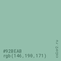 Цвет #92BEAB в цветовой модели RGB обозначается тремя октетами (146, 190, 171) в десятичном формате и #92BEAB в шестнадцатиричном (hex) формате, которые являются интенсивностью красного 146 (hex 92), интенсивность зелёного 190 (hex BE) и интенсивность синего 171 (hex AB).