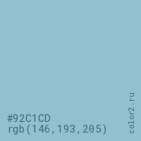 Цвет #92C1CD в цветовой модели RGB обозначается тремя октетами (146, 193, 205) в десятичном формате и #92C1CD в шестнадцатиричном (hex) формате, которые являются интенсивностью красного 146 (hex 92), интенсивность зелёного 193 (hex C1) и интенсивность синего 205 (hex CD).
