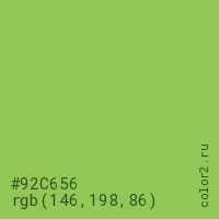 Цвет #92C656 в цветовой модели RGB обозначается тремя октетами (146, 198, 86) в десятичном формате и #92C656 в шестнадцатиричном (hex) формате, которые являются интенсивностью красного 146 (hex 92), интенсивность зелёного 198 (hex C6) и интенсивность синего 86 (hex 56).