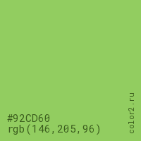 Цвет #92CD60 в цветовой модели RGB обозначается тремя октетами (146, 205, 96) в десятичном формате и #92CD60 в шестнадцатиричном (hex) формате, которые являются интенсивностью красного 146 (hex 92), интенсивность зелёного 205 (hex CD) и интенсивность синего 96 (hex 60).