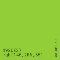 Цвет #92CE37 в цветовой модели RGB обозначается тремя октетами (146, 206, 55) в десятичном формате и #92CE37 в шестнадцатиричном (hex) формате, которые являются интенсивностью красного 146 (hex 92), интенсивность зелёного 206 (hex CE) и интенсивность синего 55 (hex 37).