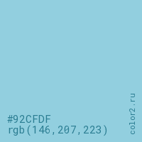 Цвет #92CFDF в цветовой модели RGB обозначается тремя октетами (146, 207, 223) в десятичном формате и #92CFDF в шестнадцатиричном (hex) формате, которые являются интенсивностью красного 146 (hex 92), интенсивность зелёного 207 (hex CF) и интенсивность синего 223 (hex DF).
