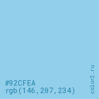 Цвет #92CFEA в цветовой модели RGB обозначается тремя октетами (146, 207, 234) в десятичном формате и #92CFEA в шестнадцатиричном (hex) формате, которые являются интенсивностью красного 146 (hex 92), интенсивность зелёного 207 (hex CF) и интенсивность синего 234 (hex EA).