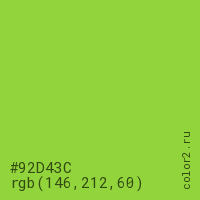 Цвет #92D43C в цветовой модели RGB обозначается тремя октетами (146, 212, 60) в десятичном формате и #92D43C в шестнадцатиричном (hex) формате, которые являются интенсивностью красного 146 (hex 92), интенсивность зелёного 212 (hex D4) и интенсивность синего 60 (hex 3C).