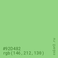 Цвет #92D482 в цветовой модели RGB обозначается тремя октетами (146, 212, 130) в десятичном формате и #92D482 в шестнадцатиричном (hex) формате, которые являются интенсивностью красного 146 (hex 92), интенсивность зелёного 212 (hex D4) и интенсивность синего 130 (hex 82).
