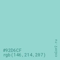Цвет #92D6CF в цветовой модели RGB обозначается тремя октетами (146, 214, 207) в десятичном формате и #92D6CF в шестнадцатиричном (hex) формате, которые являются интенсивностью красного 146 (hex 92), интенсивность зелёного 214 (hex D6) и интенсивность синего 207 (hex CF).