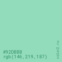 Цвет #92DBBB в цветовой модели RGB обозначается тремя октетами (146, 219, 187) в десятичном формате и #92DBBB в шестнадцатиричном (hex) формате, которые являются интенсивностью красного 146 (hex 92), интенсивность зелёного 219 (hex DB) и интенсивность синего 187 (hex BB).