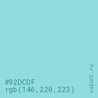 Цвет #92DCDF в цветовой модели RGB обозначается тремя октетами (146, 220, 223) в десятичном формате и #92DCDF в шестнадцатиричном (hex) формате, которые являются интенсивностью красного 146 (hex 92), интенсивность зелёного 220 (hex DC) и интенсивность синего 223 (hex DF).