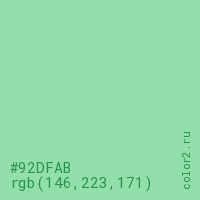 Цвет #92DFAB в цветовой модели RGB обозначается тремя октетами (146, 223, 171) в десятичном формате и #92DFAB в шестнадцатиричном (hex) формате, которые являются интенсивностью красного 146 (hex 92), интенсивность зелёного 223 (hex DF) и интенсивность синего 171 (hex AB).