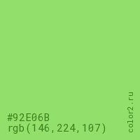 Цвет #92E06B в цветовой модели RGB обозначается тремя октетами (146, 224, 107) в десятичном формате и #92E06B в шестнадцатиричном (hex) формате, которые являются интенсивностью красного 146 (hex 92), интенсивность зелёного 224 (hex E0) и интенсивность синего 107 (hex 6B).